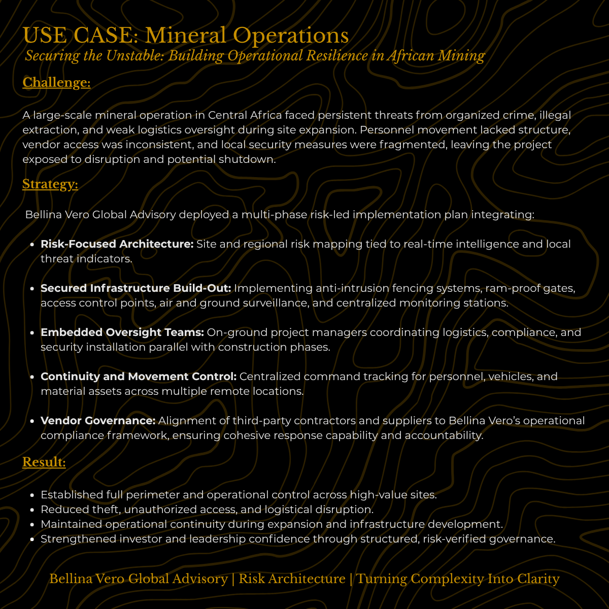 Bellina Vero Global Advisory is built to solve problems others avoid. We specialize in managing high-risk, high-value projects and large-scale operations where risk, logistics, and precision converge. From complex infrastructure developments to high-profile international events, we bring structure, oversight, and accountability to environments where failure is not an option.